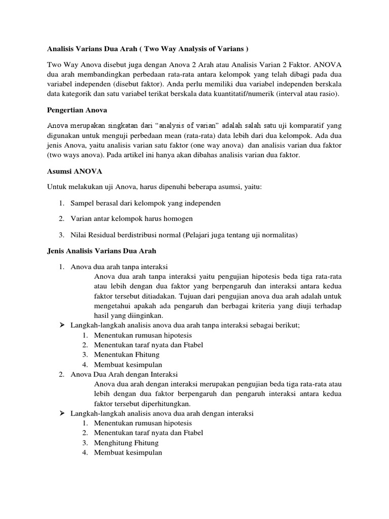 Pengertian Analisis Varians : Analisis varians (analysis of variance, anova) adalah suatu metode analisis statistika yang termasuk ke dalam cabang statistika inferensi.. Analisis varians dari wikipedia bahasa indonesia, ensiklopedia bebas belum diperiksa analisis varians ( analysis analysis of variance variance , anova) adalah suatu metode analisis statistika. Analisis varians belanja daerah analisis ini merupakan analisis terhadap perbedaan atau selisish antara realisasi belanja dengan anggaran belanja. Varian dan standar deviasi adalah istilah yang paling umum digunakan dalam teori probabilitas dan statistik untuk lebih menggambarkan ukuran penyebaran di sekitar kumpulan jenis data penelitian. Analisis varians yang tidak hanya memiliki satu variabel disebut dengan analisis varians dengan klasifikasi ganda atau jamak. Wawasan dan informasi baru yang diperoleh, kemudian menjadi dasar.