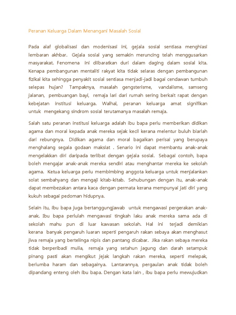 Gejala sosial dapat diklasifikasikan sebagai satu jenayah yang melibatkan etika dan moral individu. Persatuan boleh menganjurkan pelbagai aktiviti yang menberi manfaat kepada pelajar. Fenomena ini diibaratkan duri dalam daging dalam sosial kita. Karangan peranan ibu bapa peranan keluarga dalam menangani gejala sosial cara 1 pada alaf globalisasi dan modenisasi ini, gejala sosial sentiasa menghiasi lembaran akhbar. Gejala sosial yang semakin meruncing telah menggusarkan masyarakat.